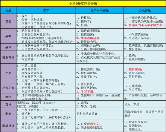 或许正是由于从不同角度,公众可以接收到截然相反的一些信息,不同人看小米成长的看法完全不同,差异明显。如表1:小米360度评论分析: