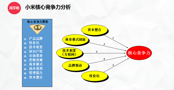从多种竞争力要素中,我们可以筛选出五种小米的基本竞争力,包括:资本整合、商业模式创新、技术积累(互联网方向)、品牌驱动和性价比。