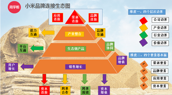 公司边界:小米这两个字实际上已经不仅仅是雷军创立的小米公司,在更多人的心智中其实早已经成为小米大生态的代表,也包括很多雷军创立的顺为资本投资企业和小米自身参股企业。小米生态已经打破了这些公司的边界,在战略金字塔模型的红色部分就是打破边界的连接方式,我们看到包括渠道、品牌、应用和资本四个维度是小米打破各个公司边界共同的部分,也是小米的四个基本面。这四点就是雷军统治生态公司的四个战略制高点。
