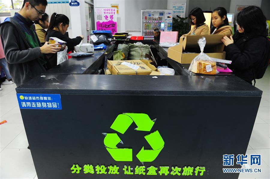 11月16日,在江苏无锡的江南大学快递超市,一名快递收发人员挑选可以再次利用的纸箱。