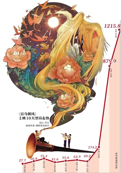 《百鸟朝凤》与《美国队长》一同上映,上映一周后票房不到400万,徘徊于360万左右,上映首日排片占比2%(这也是上映一周的最高点),票房占比多日不足1%。影片呈现基本符合文艺片走势,由于场均人次不多,首日获票房27.7万,首周末总票房仅120万左右。而来到工作日后,票房跌幅虽不明显,但一周累计票房仅360万。