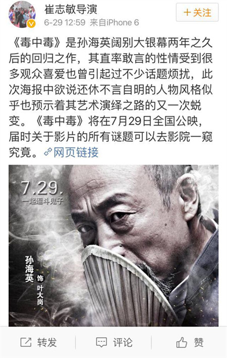 6月29日,@崔志敏导演 在微博曝光了孙海英最新电影《毒中毒》海报,据了解,《毒中毒》是一部战争悬疑喜剧爱情电影,将于7月29日全国公映。