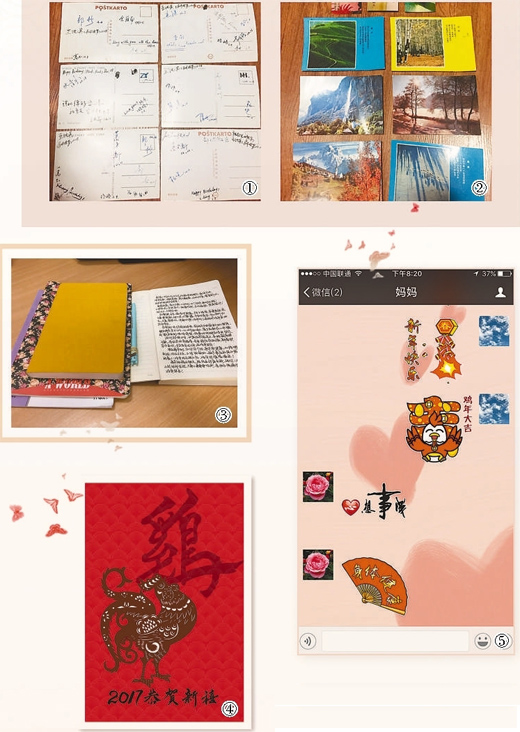图①图②:丁莉收集的各种贺卡。 图③:林晓颖抄写的春节祝福短信。图④:鸡年贺年卡。图⑤:通过微信发送新年祝福表情的截图。