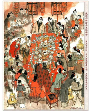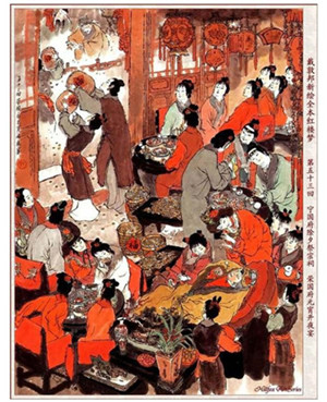 散过押岁钱之后,就摆上过年时的“合欢宴”。《红楼梦》中的吃,无论是令刘姥姥食而不知其味的“茄鲞”,“一道茄子要十来只鸡来配”,还是宝玉湘云他们在芦雪庵即景联诗、烤鹿肉,总能令人大开眼界。虽然作者在这一回对宴席似乎颇吝惜笔墨,只写“献屠苏酒、合欢汤、吉祥果、如意糕”,但从前文铺垫的排场来看,贾府年夜宴堪比满汉全席、遍是南北珍味的场景也可以想见了。