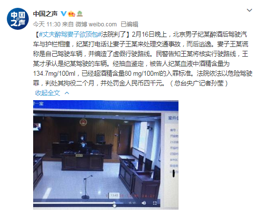 2月16日晚上,北京男子纪某醉酒后驾驶汽车与护栏相撞,纪某打电话让妻子王某来处理交通事故,而后逃逸。妻子王某谎称是自己驾驶车辆,并编造了虚假行驶路线。民警告知王某将核实行驶路线,王某才承认是纪某驾驶的车辆。经抽血鉴定,被告人纪某血液中酒精含量为134.7mg/100ml,已经超酒精含量80 mg/100ml的入罪标准。法院依法以危险驾驶罪,判处其拘役二个月,并处罚金人民币四千元。(总台央广记者孙莹)