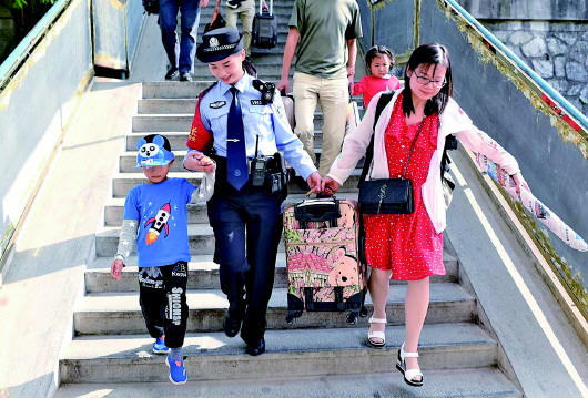 江珊(左二)在执勤中为群众提供帮助。(贺瑞明摄)