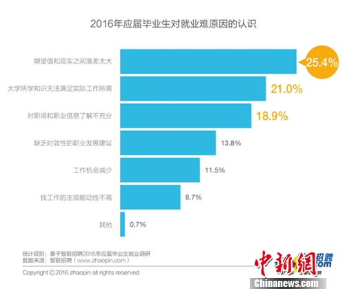 智联招聘高级职业顾问童超接受中新网采访时表示,“经调研发现,有很多大学生认为期望值和现实之间落差较大,这一方面反映出今年的就业形势中,企业提供的工作与大学生的预期存在一定差距。另一方面也反映出大学生的就业能力没有得到企业雇主的普遍认可。”