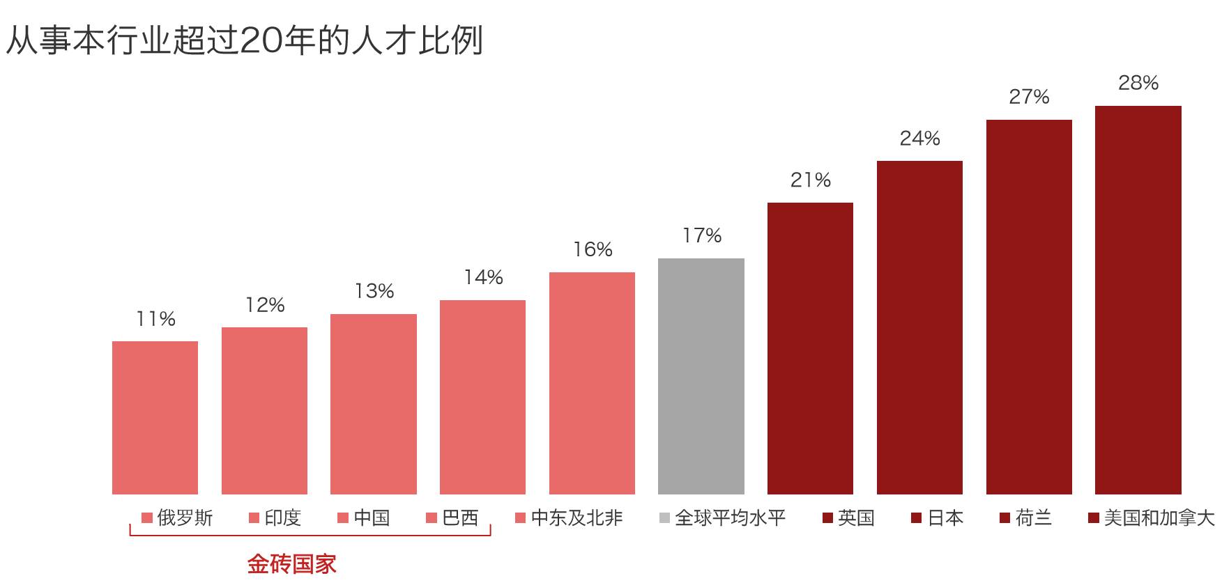 职场人士跨界跳槽的时间在全球范围内各不相同。在中国,只有 13% 的职场人士从事本行业超过 20 年,而全球平均水平是 17%,北美地区则是 28%。由于经济环境变化迅速,发展中国家 (比如金砖国家) 人才待在单一领域的稳定性远低于发达国家。