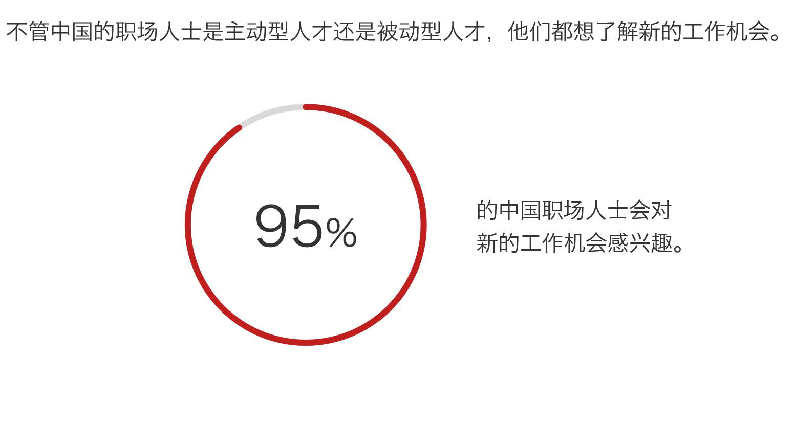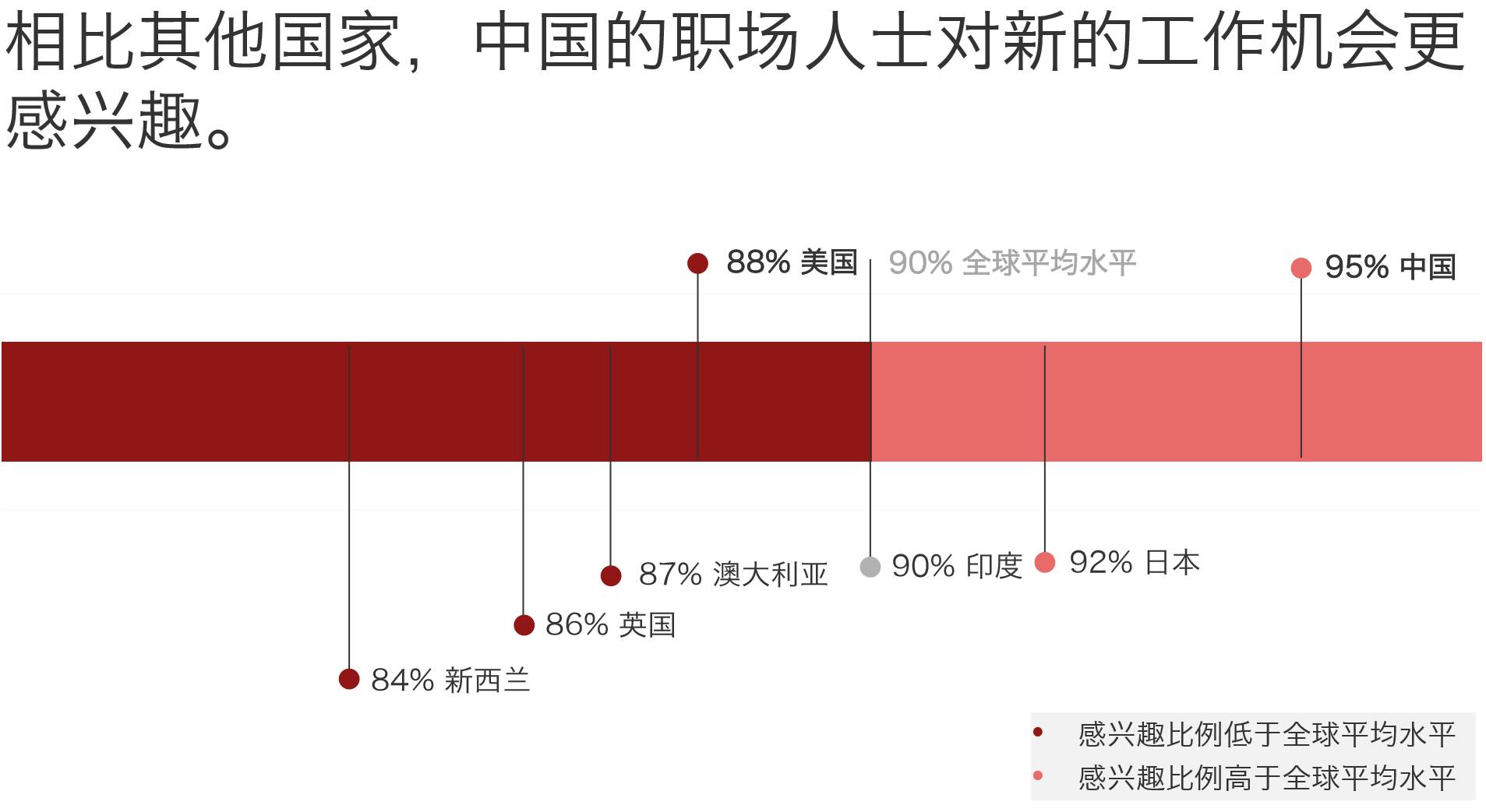 中国的职场人(高达95%)都对新的职业机会敞开怀抱,这一数字超过英国、美国、印度、日本,位居全球首位。