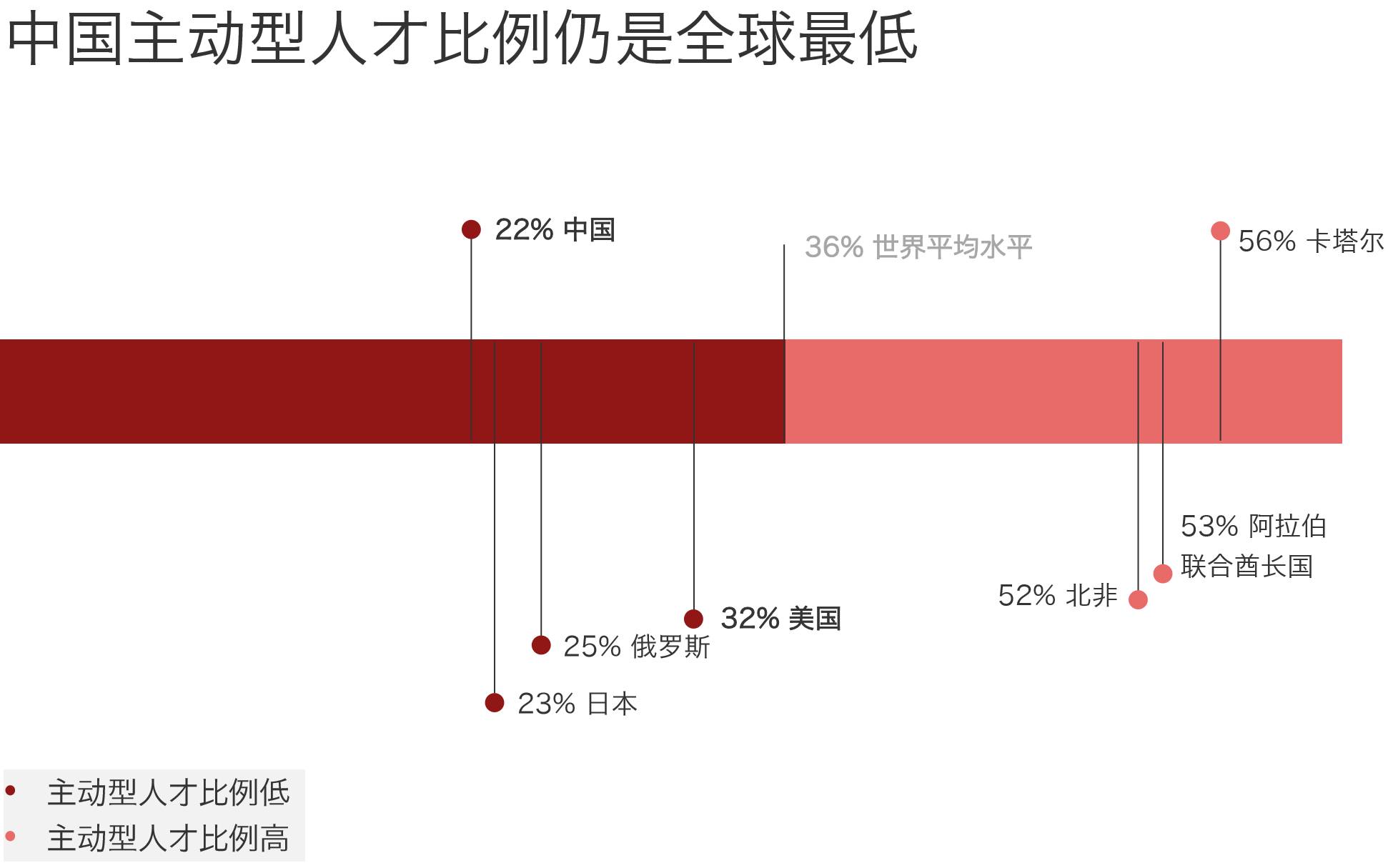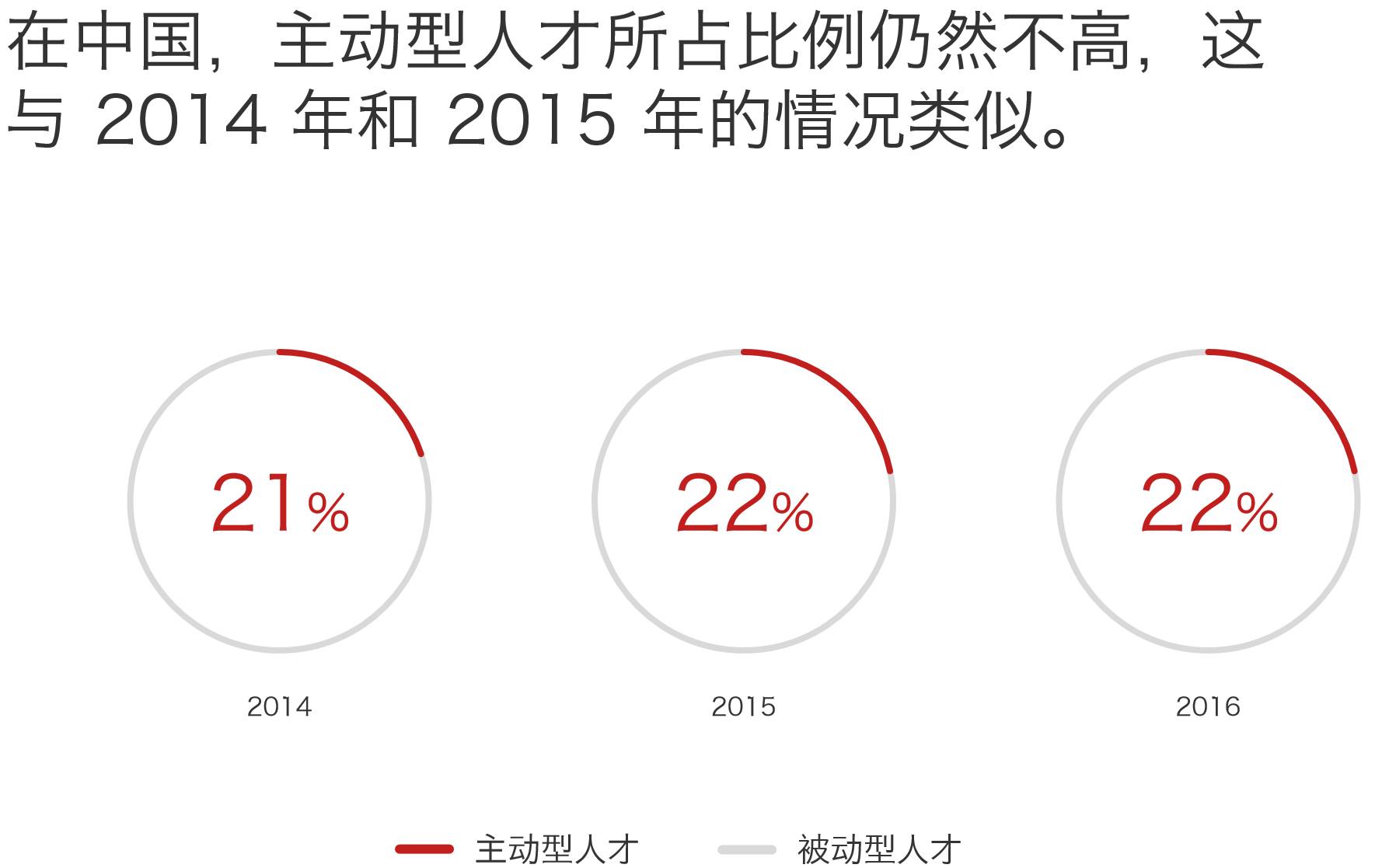 或许你会对前面的数据产生疑问:这么多人愿意留心身边的新机遇和产业变化,但为什么真正主动找工作的人并不多?这是因为中国人才的另一个特性:被动。只有22%的中国人才在主动寻找机会,全球最低。内敛植根在中国传统文化中,也表现在了中国职场当中。