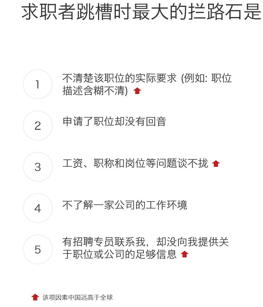 更具挑战性的工作和职业发展机会能够吸引中国职场人士去寻找新的工作机会。相比而言,北美职场人士则更关心公司前景是否稳定,与同事关系是否融洽。因此一定要告诉中国的求职者,为什么招聘企业和工作职位会有快速的发展。