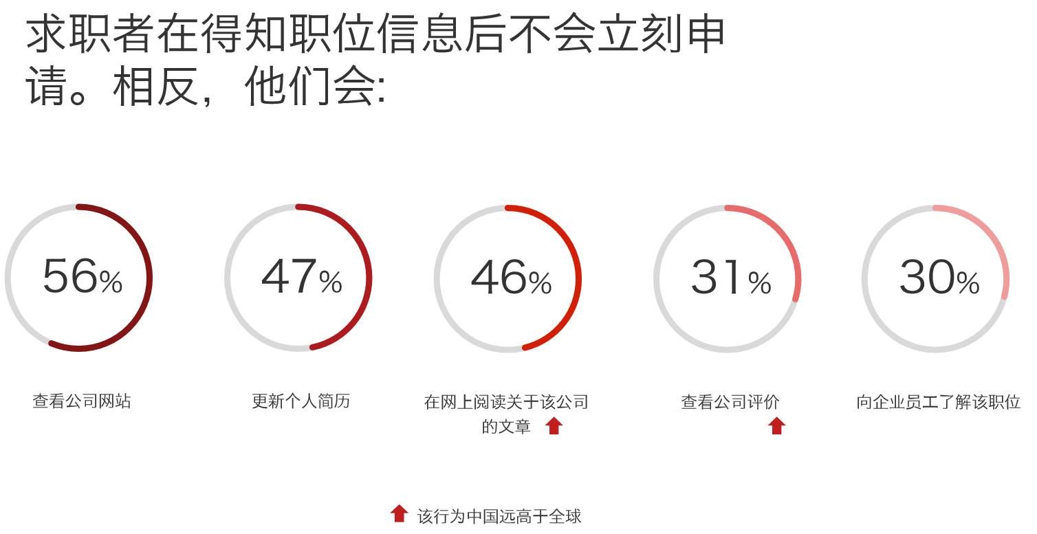 95%的中国职场人对工作机会持开放态度,位居全球首位。当今中国经济充满活力,人才市场瞬息万变。在这种情况下,中国人总是留心周围一切。眼观六路,耳听八方便是中国职场人的一大特征。