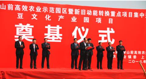 山东省临沂市费县县委副书记张钰、县政协副主席刘成武、县一中党委书记蒙山前高效农业示范园区领导小组王献德、县农业局局长王永祥等各级领导、豆黄金董事长张京宝出席了奠基仪式,在欢畅喜悦的音乐声和礼炮声中,为豆黄金天然腐竹产业项目培土奠基。在一片欢腾喜庆的喝彩声中,上百家企业合作单位、领导及新闻工作者、项目工程人员及豆黄金员工共同见证了这一盛况,各大媒体用镜头记录下了豆黄金这历史性的一刻。