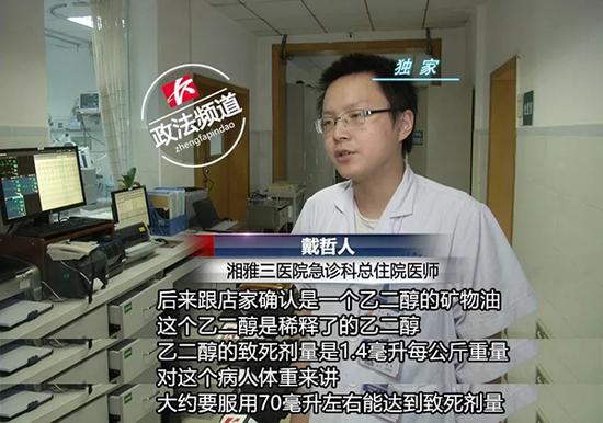 记者从湘雅三医院戴医生处了解到,由于李先生的妻子喝了一杯这种“环保油”,所以目前,在医院接受治疗的主要是李先生的妻子。同时,店家告诉医生这种“环保油”的主要成份是乙二醇。