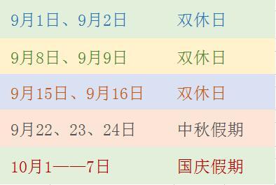 10月1日—7日放假,9月29、30日(星期六、日)上班。