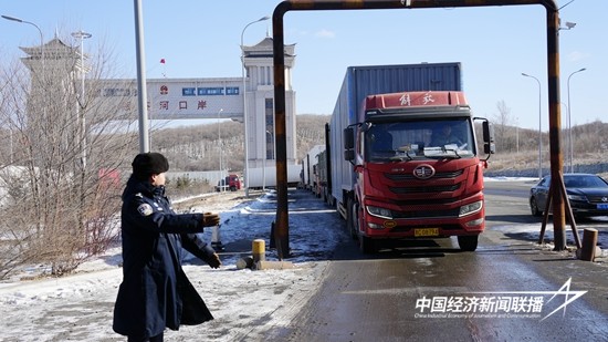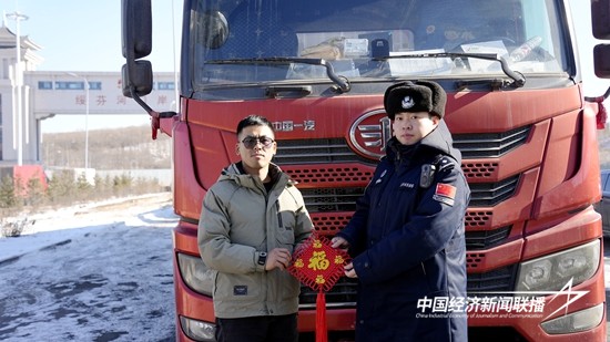 在绥芬河公路口岸货检通道,准备回国的货车络绎不绝地在国门下排成S型长龙,在这里执勤的移民管理警察们在寒冬中换班接力,有条不紊地验放着出入境的货车。执勤五队民警汤有志说:“这些跨境运输的司机都很辛苦,我们能做到的就是严谨查验、快速验放,让大家早点回家过年。”