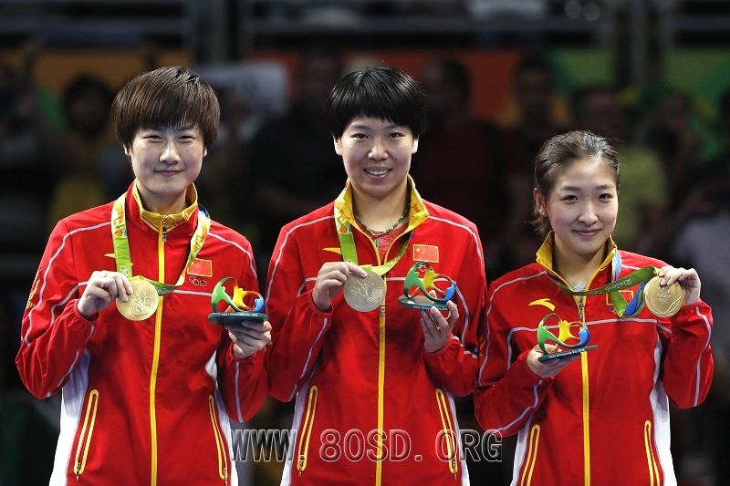 中国乒乓球选手丁宁、李晓霞和刘诗雯(从左至右)在女子团体赛中夺得金牌