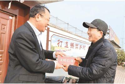 山东省日照市农村商业银行近年来开展“文明信用工程”建设活动,将有形资产担保转为文明信用担保,解决农户贷款难、担保难问题。图为2018年12月24日,东港区涛雒镇东石梁头村村民王建立(右)被授予“文明信用户”。新华社记者 范长国摄