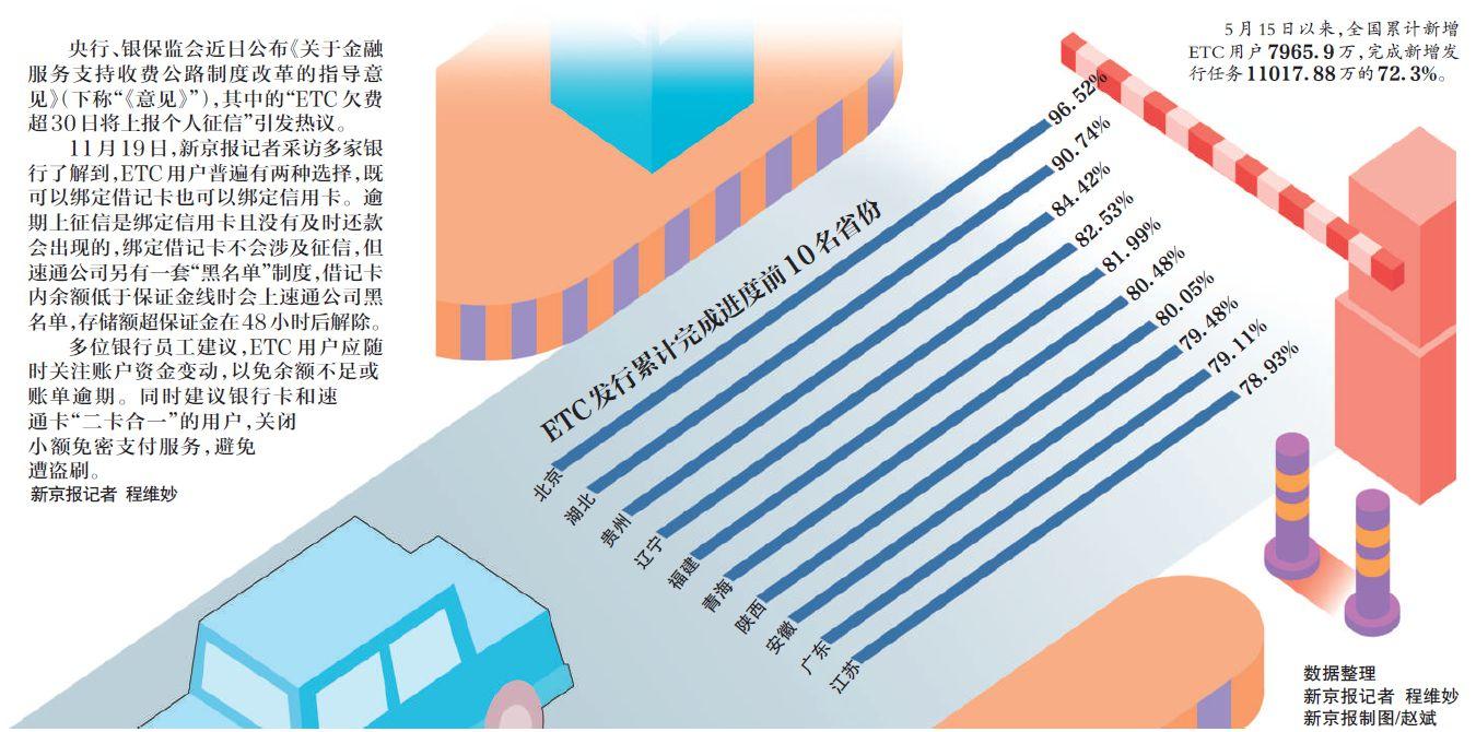 11月19日,新京报记者采访多家银行了解到,ETC用户普遍有两种选择,既可以绑定借记卡也可以绑定信用卡。逾期上征信是绑定信用卡且没有及时还款会出现的,绑定借记卡不会涉及征信,但速通公司另有一套“黑名单”制度,借记卡内余额低于保证金线时会上速通公司黑名单,存储额超保证金在48小时后解除。