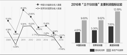 500强的营业收入很高,但盈利能力落后于美国。中国500强营业收入利润率、净资产利润率分别为4.61%和9.6%,分别比美国500强低2.39和3.09个百分点。在2016世界500强中,美国企业的营业收入利润率、净资产利润率分别为8.05%、14.37%,但中国内地企业却只有5.42%、9.86%,也远低于美国大企业。