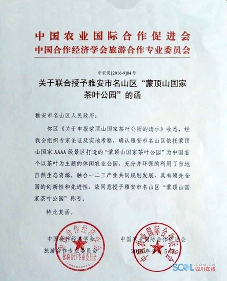 9月21日,记者从名山区获悉,近日,由农业部主管的中国农业国际合作促进会、中国合作经济学会旅游合作专业委员会联合授予雅安市名山区“蒙顶山国家茶叶公园”称号,雅安市名山区新添一个“国家级”公园。
