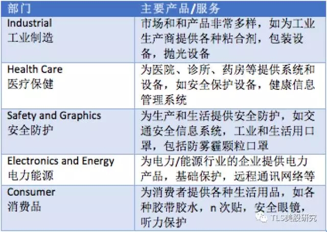 100多年以来,3M公司开发了近七万种产品,目前整体业务包括5个部分,分别是:工业制造(Industrial)、医疗保健(Health Care)、安全防护(Safety and Graphics)、电力能源(Electronics and Energy)和消费品(Consumer)。