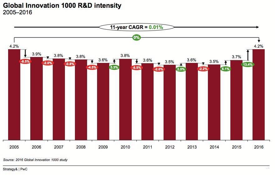 与之对应的是,2005-2016年,这一指标在全球1000家公司的行业平均值基本位于4%之下。