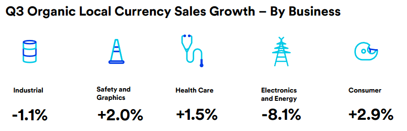 而3M公司去年第三季度除了安全防护业务板块销售增加2%外,保健和消费品业务分别增加1.5%和2.9%,而电力能源业务则大幅下降8.1%,同时工业制造业务下降1.1%。