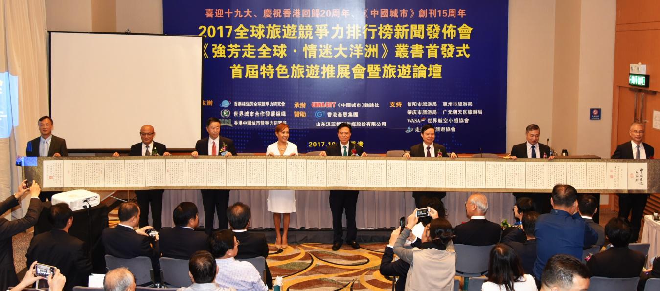 桂强芳作了题为《跟着“一带一路” 一起走全球》的主旨致辞,回答了多个媒体记者现场提问。他说,一带一路倡议提出4年多以来,已成为全球关注的热点。本次发布的榜单中,涉及到的中国城市占榜单城市总数的三分之一,这可以看出中国在着力打造旅游强国,也在创建更多的旅游名城。该会副会长刘岩松进行了《中国迈向“旅游强国”的必由之路》主旨演讲。世界旅游之最评定委员会、丛书编辑委员会特地以“走遍全球第一人”美誉向桂强芳发来《世界旅游之最》名录入选证书,祝贺桂强芳从1997-2017的二十年间走进253个国家和地区、1205个异国城市而创造迄今已知的全球最高纪录。会上还展示了九米墨宝长卷《中国香港文脉赋》。该赋是庆祝香港回归二十周年期间,桂强芳研究团队以中华传统辞赋的体裁,形成的一项集体创作成果,精心抒写了香港与祖国母亲之间的根亲史、血脉情,在会上展示并作为香港爱国爱港学者群体喜庆香港回归和祝贺中共十九大胜利召开的一份献礼。