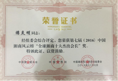 游炎明董事长获得2016“全球湘商十大杰出商会会长”