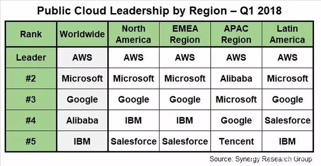 据研究数据显示,在2018年第一季度的公有云市场上,亚马逊AWS占据全球40%的市场份额,在亚太等全球四个主要区域市场全部排名第一。作为亚马逊增长最快的业务之一,AWS在2017年的增长率达43%,去年四季报中AWS的收入为51亿美元。