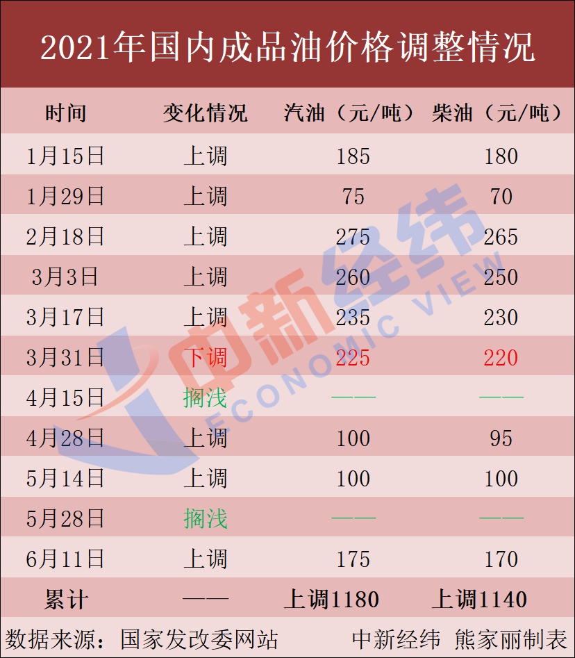 据中新经纬客户端统计,2021年以来,国内成品油调价已进行了十一轮,汽油总计上调了1180元/吨,柴油总计上调了1140元/吨。如果此次价格上调落实,2021年成品油调价将呈现“九涨一跌两搁浅”的格局。