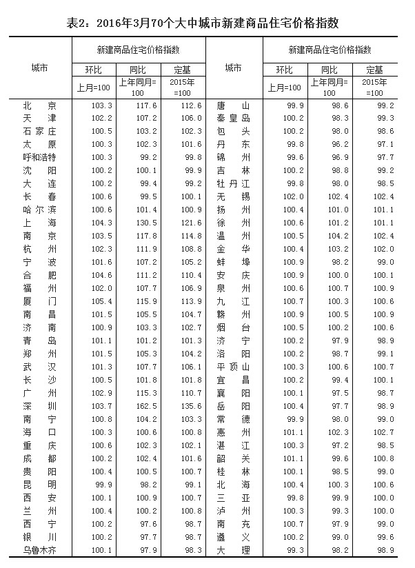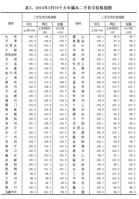 一、绝大多数城市房价环比上涨,上涨城市个数比上月大幅增加,总体涨幅扩大。发布的数据显示,3月份70个大中城市新建商品住宅和二手住宅价格环比上涨的城市分别有62个和54个,分别比上月增加15个和20个;持平的城市个数分别为0个和3个,分别比上月减少8个和5个;下降的城市个数分别为8个和13个,分别比上月减少7个和15个。新建商品住宅价格环比上涨的62个城市里,涨幅高于上月的城市有55个,比2月份增加22个;二手住宅价格环比上涨的54个城市里,涨幅高于上月的城市有47个,比2月份增加23个。据测算,70个大中城市新建商品住宅和二手住宅价格环比综合平均涨幅均明显扩大,分别比上月扩大0.6和1.2个百分点。尽管绝大多数城市房价环比都出现上涨,但城市间涨幅差异仍然较大,上涨过快的城市主要集中在一线城市和部份热点二线城市,其房价涨幅远高于其他城市,其余二、三线城市房价走势相对平稳。