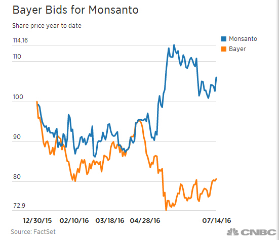 当地时间7月14日本周四,拜耳发布声明称,经过过去数周与孟山都私下商谈,修改此前报价,将收购价由每股122美元增至每股125美元,总报价增至约650亿美元,较上次提出收购前今年5月9日孟山都的收盘价溢价40%。