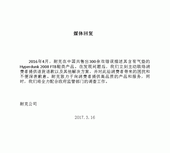 而据网易财经报道,耐克公司先后向其发送了两份声明,在第一份声明中,耐克公司称,被央视曝光的问题是耐克方面“主动发现的问题”,并将该问题归纳为其官网上对于该产品(Hyperdunk 2008 FTB)的气垫描述存在错误。同时,耐克方面承诺将对该产品进行退货,但“奇葩”的是,耐克方面还在回应中指出:“出于品牌关怀的考虑,我们还为购买该款产品的消费者提供在耐克官网购买单件产品七五折的优惠券(电子产品,特别版商品,礼品卡除外)。”