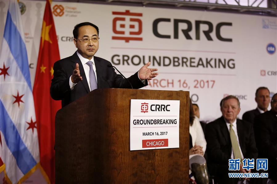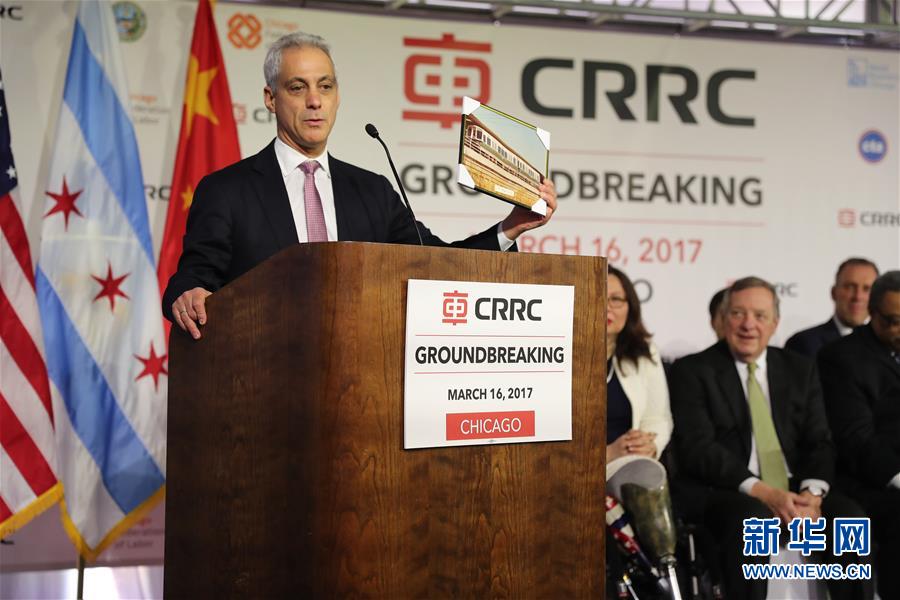 3月16日,在美国芝加哥,芝加哥市市长拉姆·伊曼纽尔(左)在动工仪式上致辞。中国中车青岛四方机车车辆股份有限公司(简称中车四方)16日在芝加哥东南郊的老工业基地举行建厂动工仪式,标志中国地铁出口发达国家最高纪录订单的生产正式启动。新华社记者汪平摄