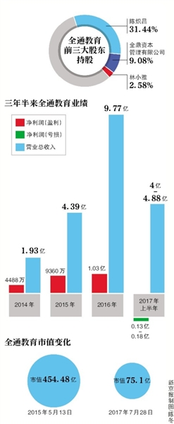 作为全通教育实际控制人陈炽昌,1971年出生,今年47岁。在2015年登上胡润中国富豪榜,陈炽昌夫妇以财富总额105亿元,排名第290位。不过2017年3月发布的2017胡润中国富豪排行榜,陈炽昌夫妇以85亿身家排名398位。两年内财富缩水20亿元,名次跌落上百名。