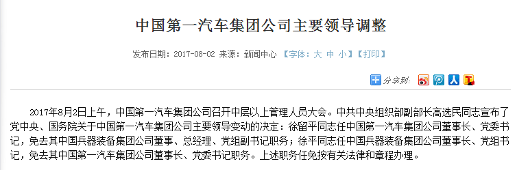一汽集团与中国兵器装备集团公示有关领导职务调整