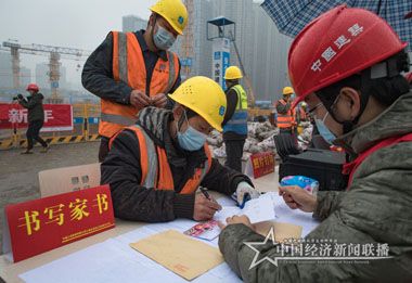 【中经联播武汉1月29日讯】在武汉长江中心项目建设工地,中建三局总承包公司为春节值守的工友现场拍摄并打印照片,工友们将照片和书写的家书以及干果、春联等年货一起,通过上门设立的邮寄点,直接寄给家人。工地项目部同时免费为工友检测核酸、发放防疫礼包,在过年期间,还将在工友生活区搭建临时影院、组织年夜饭、开设工友书屋等,让建设者们过一个安心、暖心的新年。