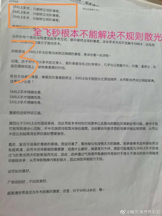 该名员工在微博爆料,她本人于2017年3月1日被重庆爱尔麦格眼科医院(重庆市经开区南城大道288号)招工为市场部员工,2017年8月医院屈光科室为了完成业绩就动员本医院员工也做屈光手术而针对院内员工推出了员工五折优惠的诱惑活动。医院多位领导就三番五次做思想工作,在院领导的一番动员后,幽灵满世界彩虹决定手术。
