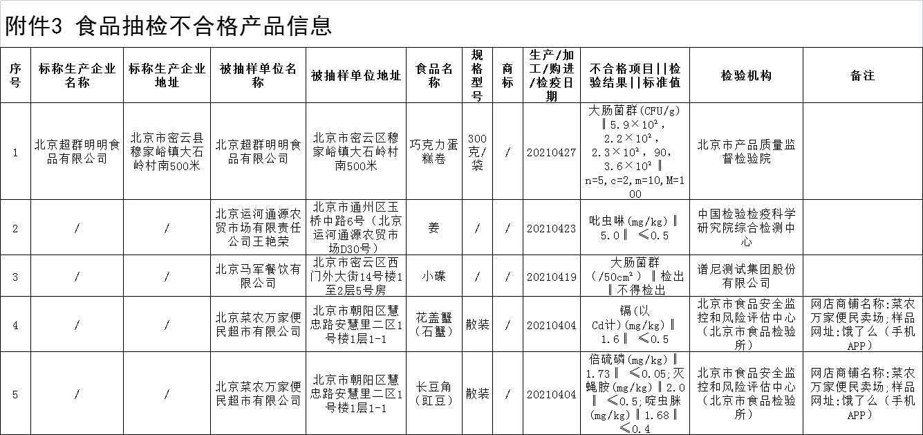 4.菜农万家便民卖场(经营者为北京菜农万家便民超市有限公司)在饿了么(手机APP)销售的花盖蟹(石蟹)中镉(以Cd计)不符合食品安全国家标准,长豆角(豇豆)中倍硫磷、灭蝇胺、啶虫脒不符合食品安全国家标准。检验机构为北京市食品安全监控和风险评估中心(北京市食品检验所)。