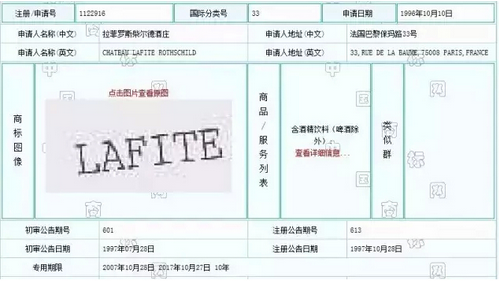 “LAFITE”商标申请日为1996年10月10日,核定使用在第33类的含酒精饮料(啤酒除外)商品上,注册人为拉菲罗斯柴尔德酒庄,专用期限至2017年10月27日。