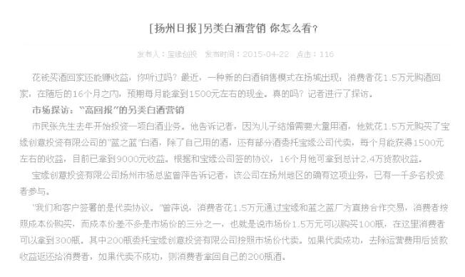 记者注意到,关于宝缘卖酒巨额返利的这一销售模式在江都及其它地方早已闹得沸沸扬扬,多家网站曾对此事进行了披露,大量网友均称这一销售模式是传销、非法集资。