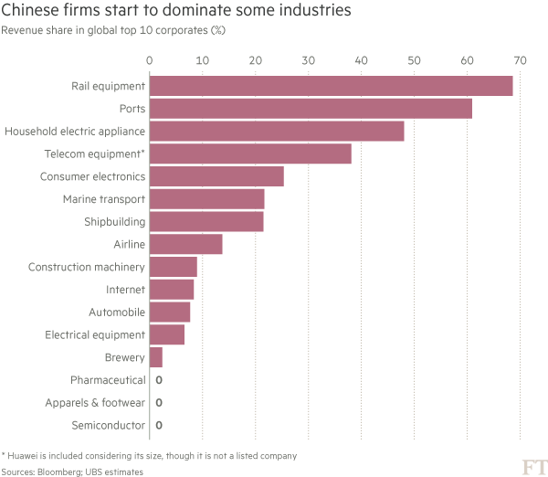 这可能会强化中国企业在其行业内正在获得的全球主导地位(见第二张图表),尤其是家用电器、消费电子和航空行业。瑞银还发现中国企业在半导体、汽车和互联网行业也有很强的海外并购兴趣。