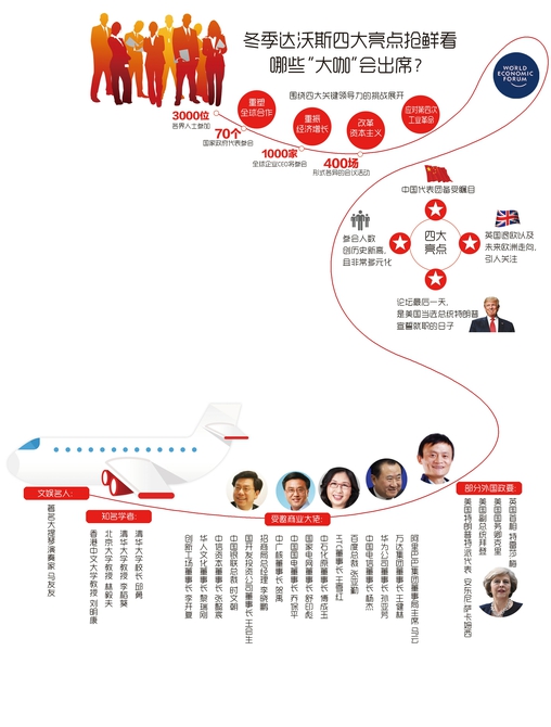 据新华网报道,本届达沃斯论坛,中国国企、民企大佬也将悉数登场。他们包括:阿里巴巴集团董事局主席马云、万达集团董事长王健林、华为公司董事长孙亚芳、创新工场董事长李开复等。