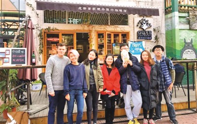 唐雨冬(右三)在自己创立的首家旅行主题咖啡馆前合影。