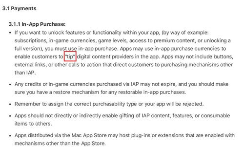 实际上,30%的“过路费”苹果一直在收,包括游戏内货币、游戏关卡、优质内容的访问权限或解锁完整版等,必须使用App内购买;而此前,对“打赏”则并未作出类似规定。
