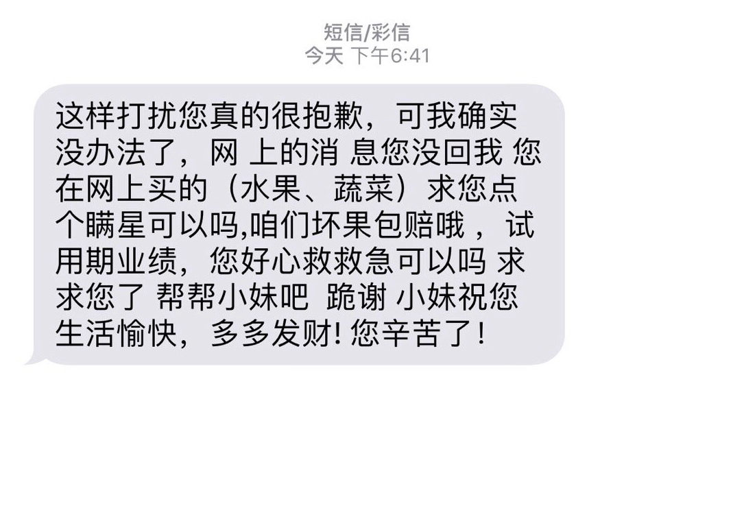 卖惨型:这样打扰您真的很抱歉。可我确实没办法了,您在网上买的水果求您点个满星可以吗?试用期业绩,求求您帮帮小妹吧,跪谢。
