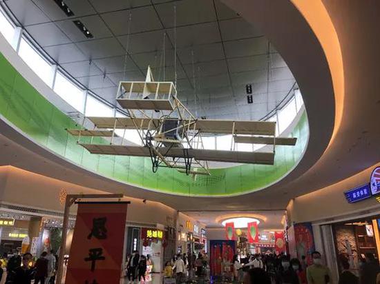 侨乡餐饮区另一边则是现代化的城市综合体的景象,值得注意的是,在这一侧的天花板上,悬挂了一家大型的木飞机。