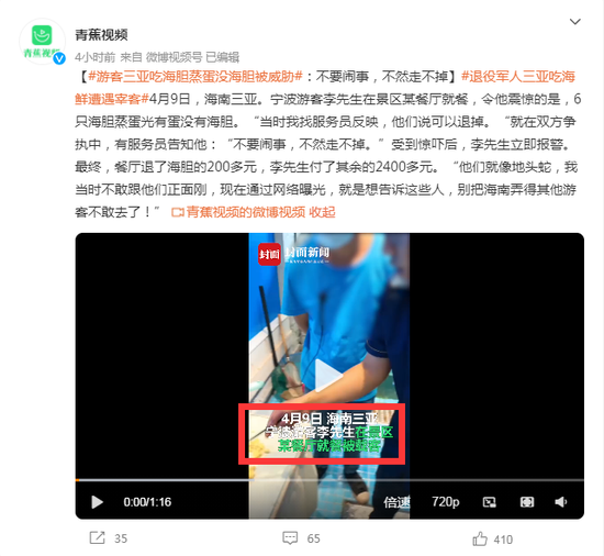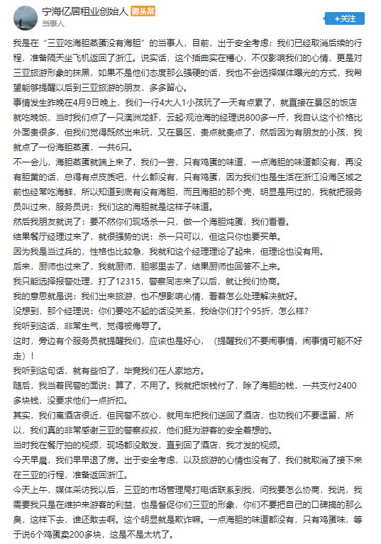 游客投诉:“在三亚吃海胆蒸蛋没海胆,还遭威胁”